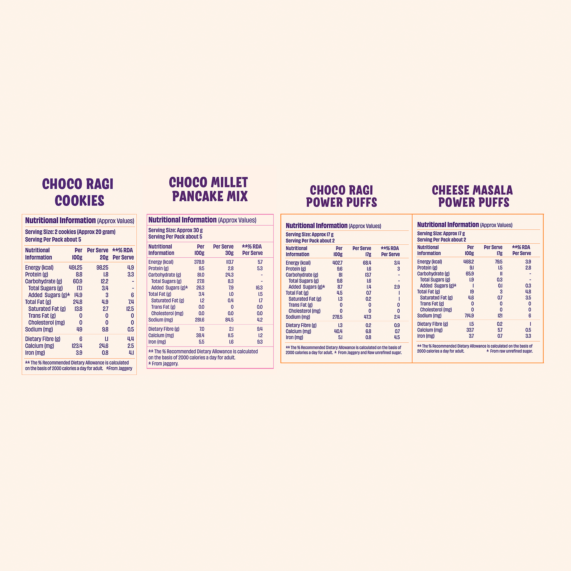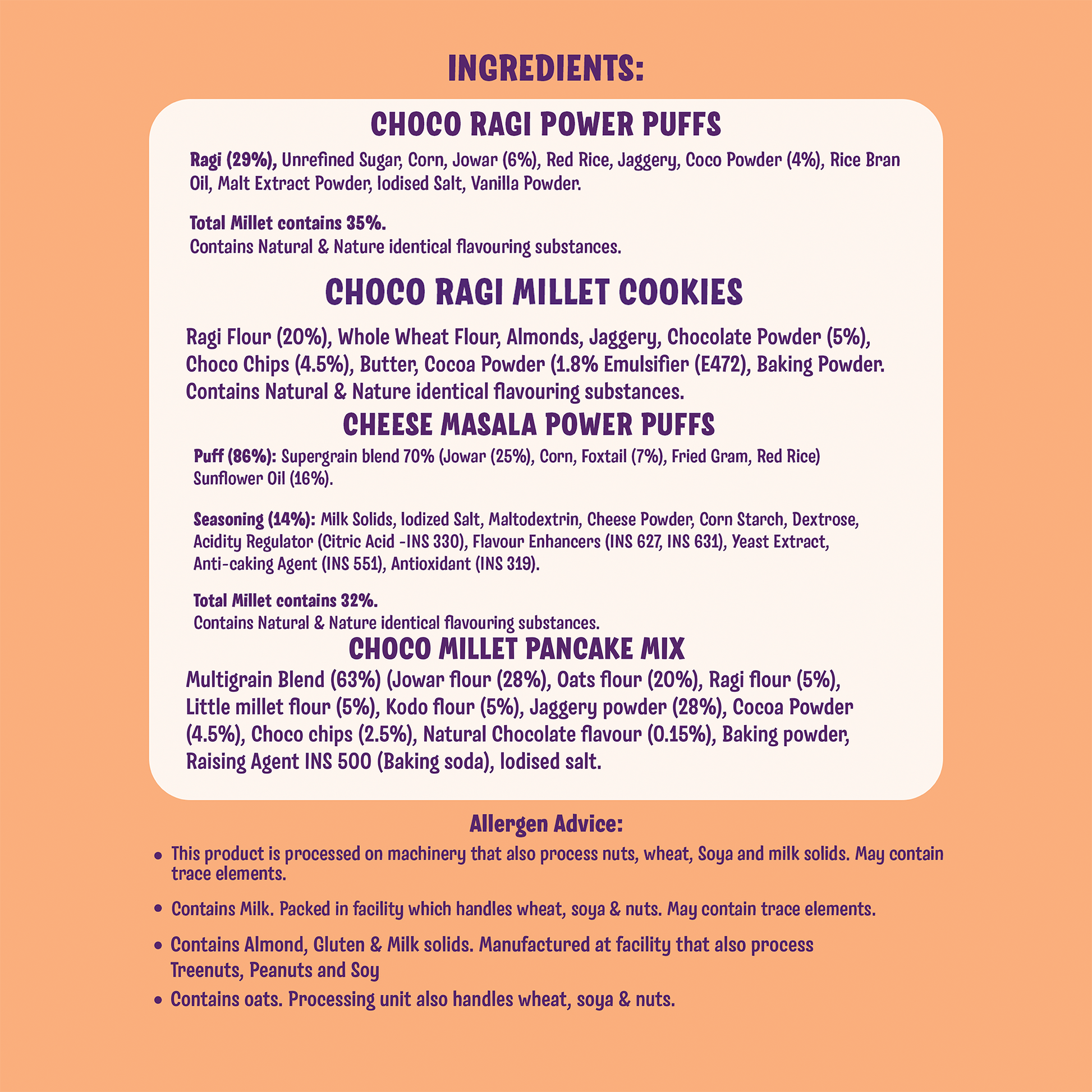 Millimo Power Puffs are made with a blend of millets & multigrains. Our Ragi Power Puffs aren’t just a snack, they make a wholesome, crunchy cereal too! High in protein and fiber from ragi, they turn into a nourishing breakfast bowl when paired with milk, yogurt, or fruit. A tasty way to start the day, for kids and grown-ups.