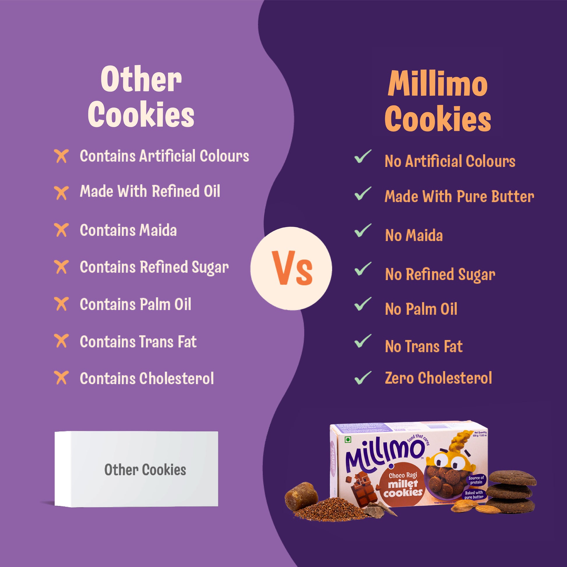 Millimo cookies are crafted with care which has the natural goodness of millets, multigrains, jaggery, nuts, and absolutely nothing artificial.