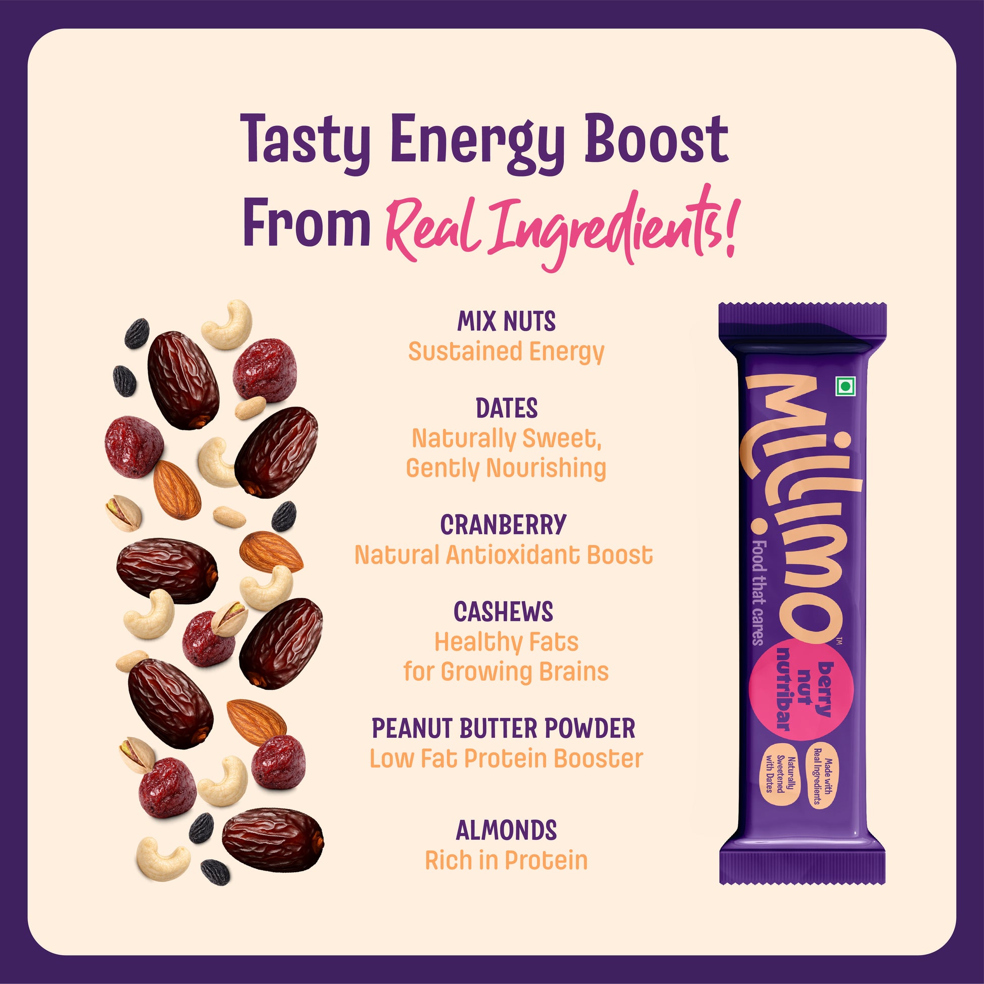 Meet our Berry Nut NutriBar — a wholesome mix of juicy cranberries, crunchy nuts, and naturally sweet dates.