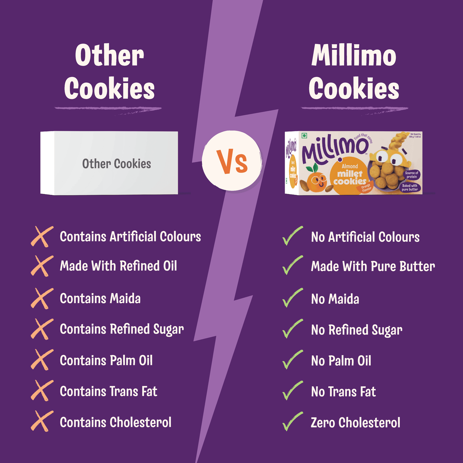 Millimo Cookies are sweetened only with jaggery, no refined sugar at all. You get a naturally sweet taste, without anything artificial or processed.