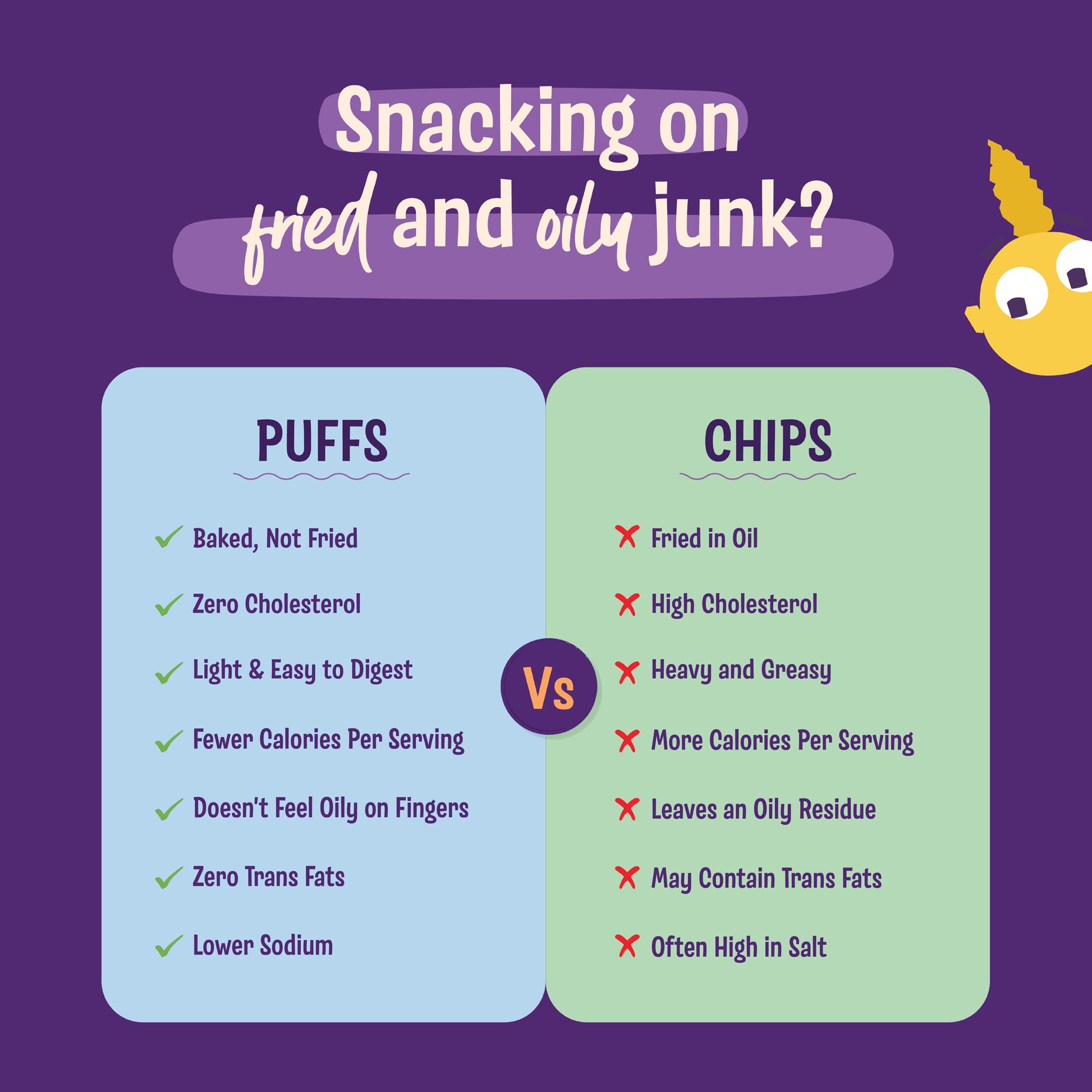 They’re made with wholesome ingredients that keep you fuller for longer and make them a much healthier choice compared to regular puffs and chips.