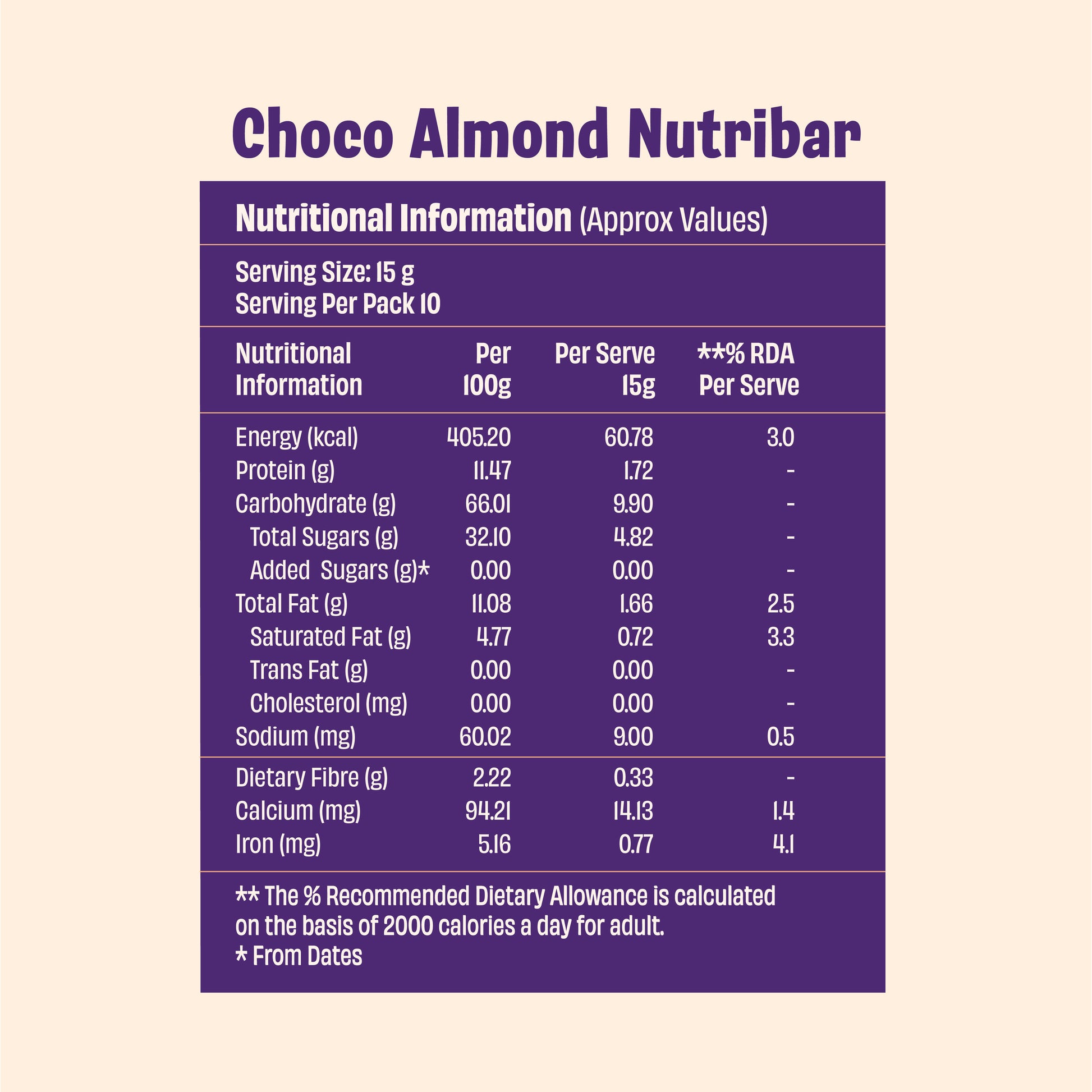 Meet our Choco Almond NutriBar — a wholesome blend of roasted almonds, rich cocoa, and naturally sweet dates.